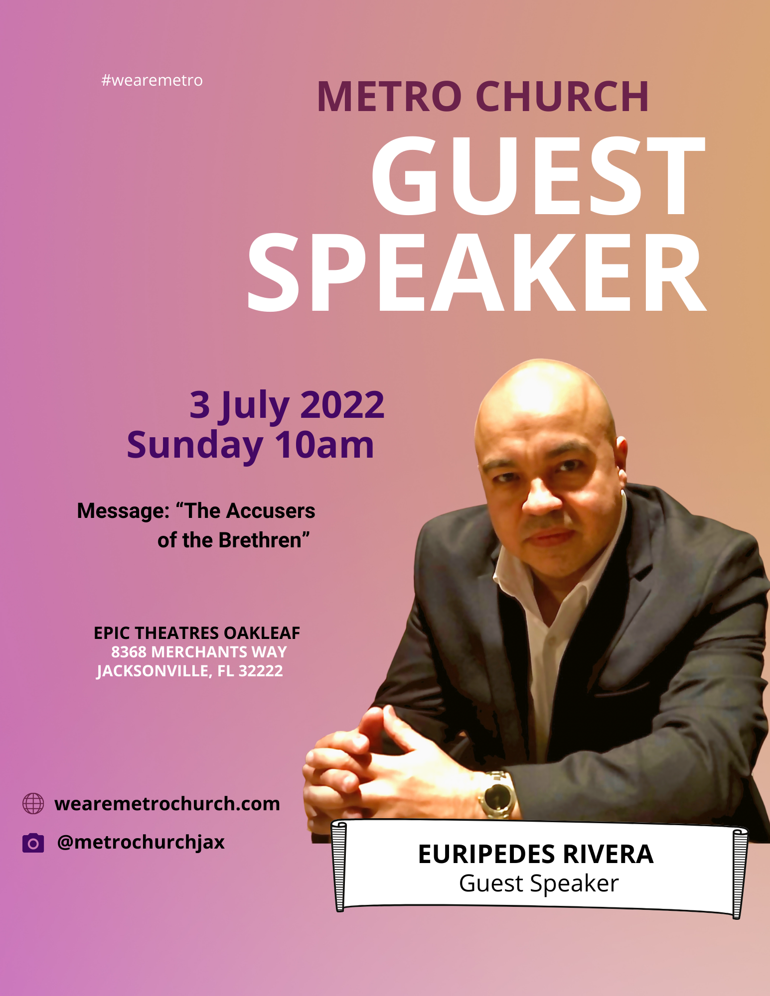 Guest Speaker- Euripedes Rivera Sunday, July 3, 2022 10:00 AM 11:15 AM Metro Church Jax 8368 Merchants Way Jacksonville, FL, 32222 United States (map) Google Calendar ICS